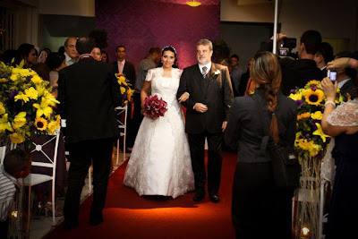 A cerimônia e a festa foram no mesmo local. Foi lindo ver a emoção do pai entregando a filha ao noivo. Outro ponto que chamou a atenção foi a troca de olhares apaixonados dos noivos.